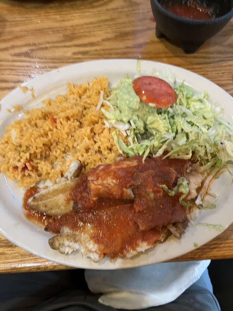 Chunks of steak with red homemade sauce. Served with rice, refried beans and tortillas.