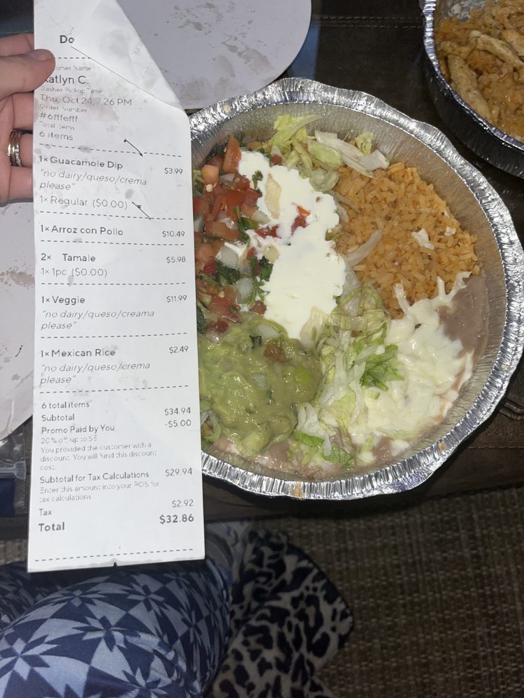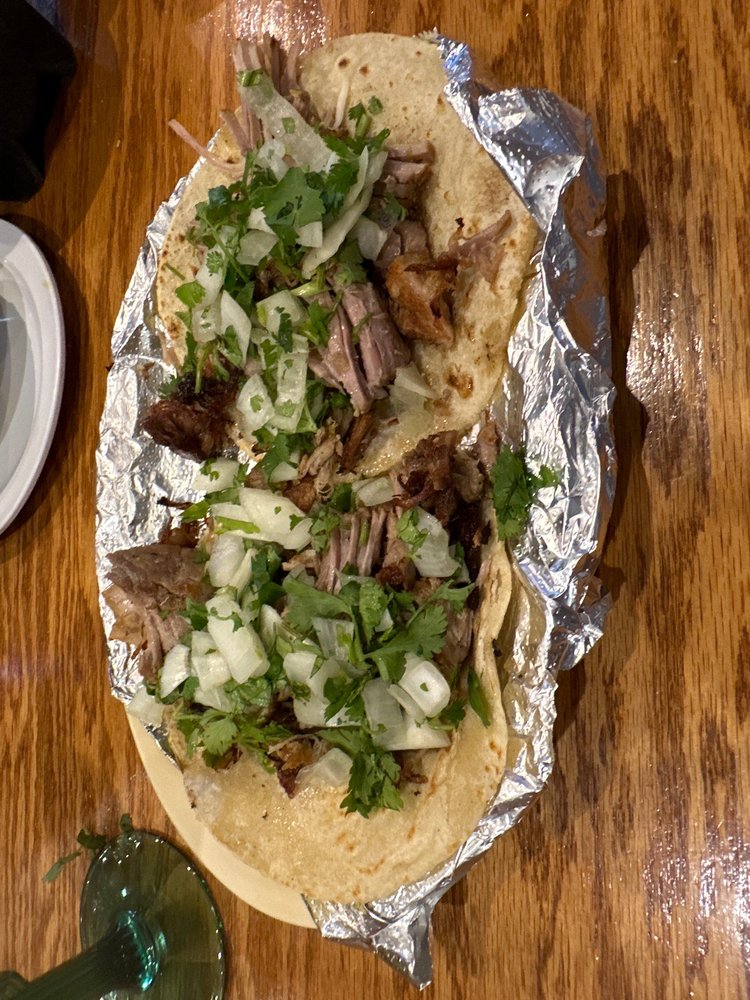 2 rolled deep fried tortillas with your choice of meat, topped with lettuce, tomatoes, guacamole, and sour cream. Served with rice and refried beans.