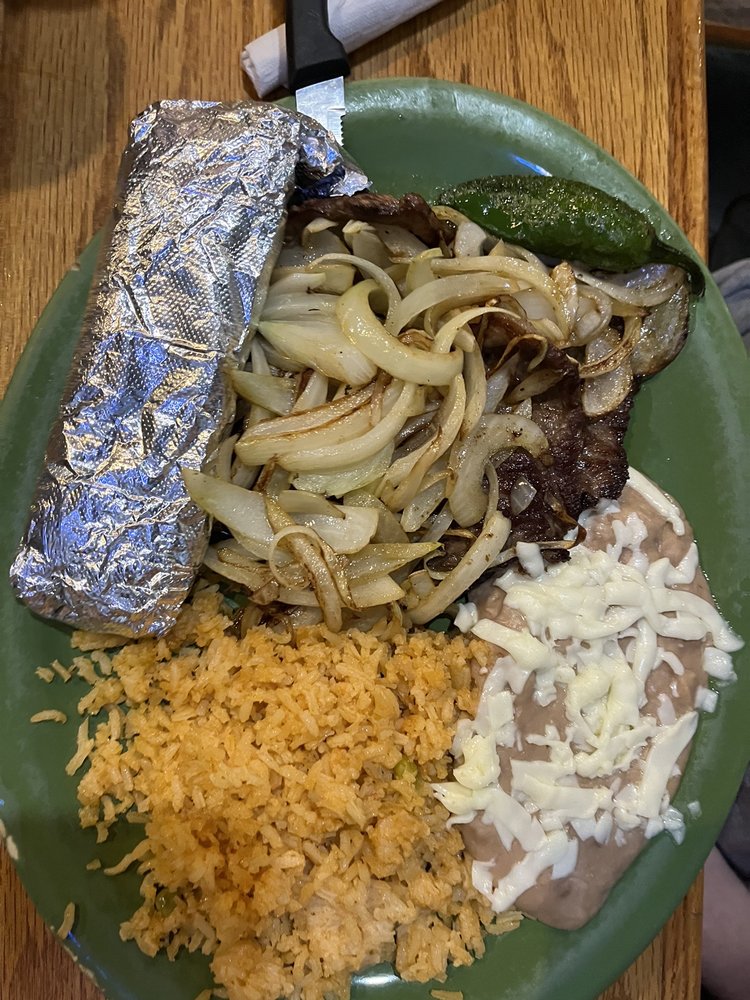Steak topped with grilled onions and a deep fried jalapeno. Served with rice, refried beans, tomatoes, lettuce, avocado slices and tortillas.